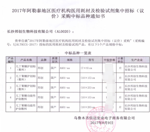 恭賀我公司產(chǎn)品在2017年新疆阿勒泰醫(yī)用耗材招標(biāo)采購(gòu)項(xiàng)目中標(biāo)